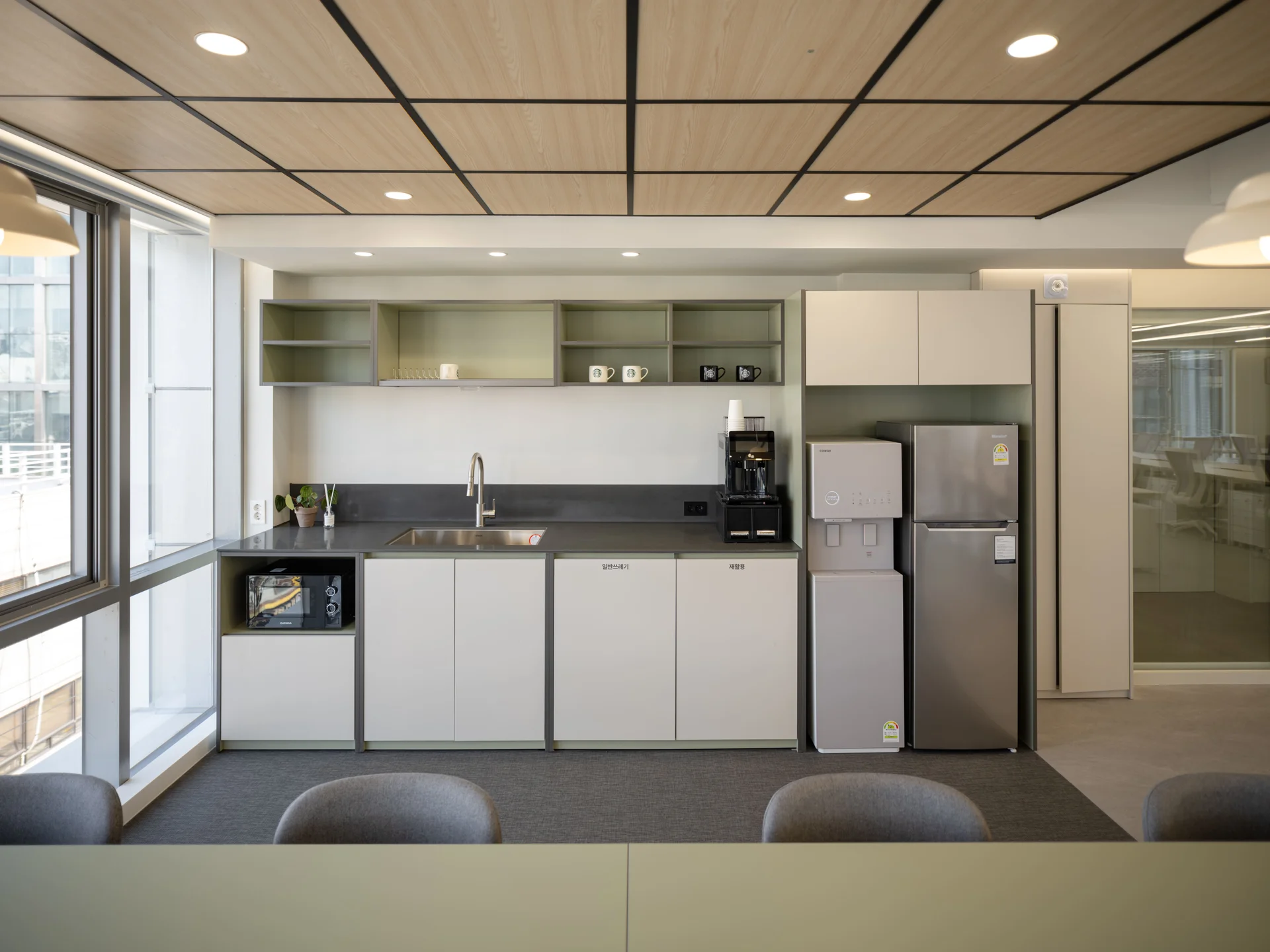 탕비실 같은 공간은 벽으로 가리지 않고 개방된 형태로 만드는 것이 좋습니다. 크지 않은 공간에 불필요한 벽을 세워서 시야를 차단하게 되면 더욱 답답해 보일 수 있기 때문입니다.