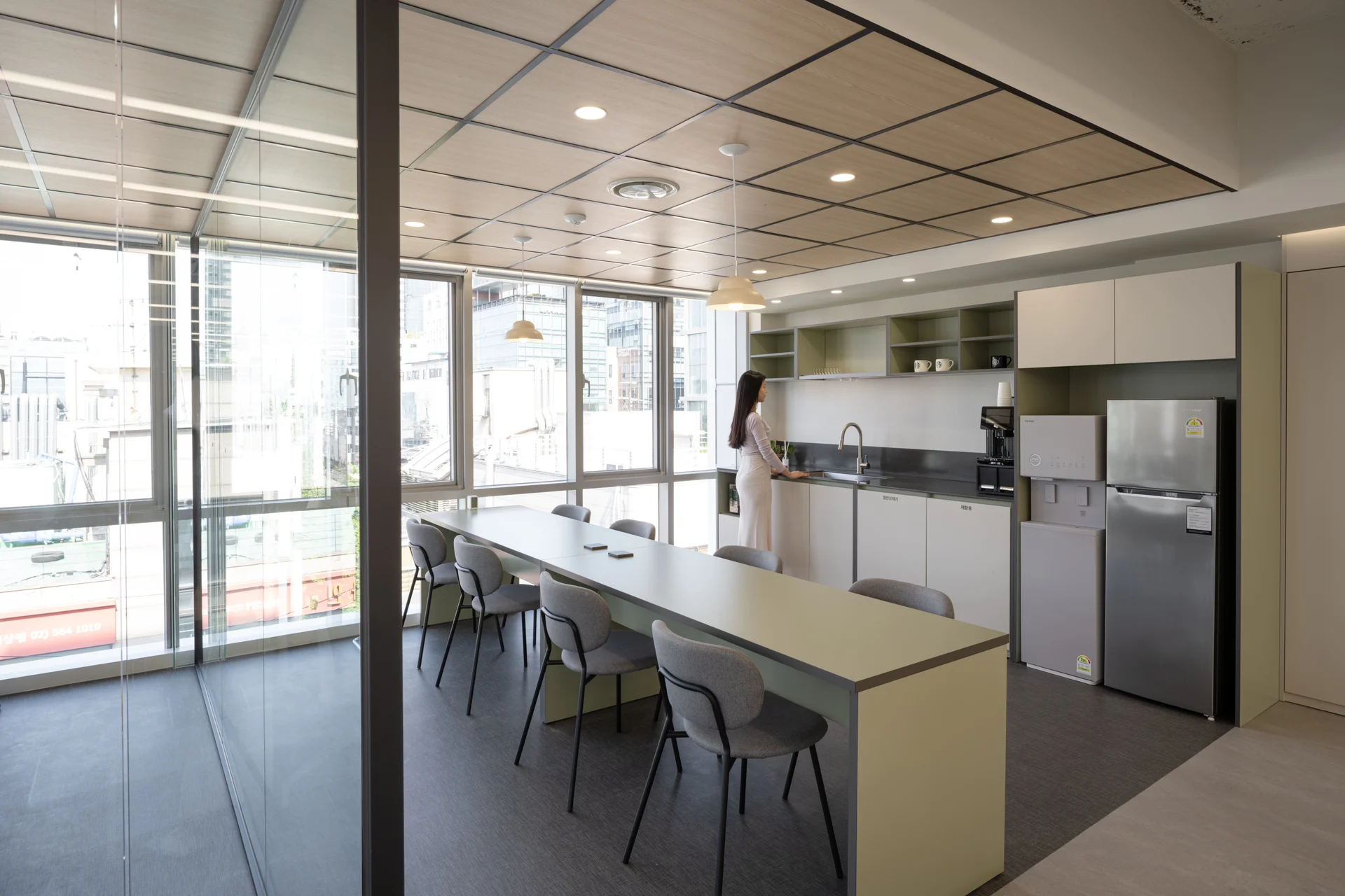 업무와 일상의 활력이 될 수 있는 오피스요. 이게 가능 하려면 ‘일을 방해하는 요소’가 없는 것이 중요해요. 사소하지만 신경 쓰이는 것들로 일의 흐름이 끊길 때가 있잖아요. 눈부신 조명이라던지, 회의실에서 흘러나오는 소음이라던지. 이렇게 맥이 끊기는 일 없이 '매끄러운 일상'이 지속될 수 있는 공간이 좋은 사무실이라고 생각해요.