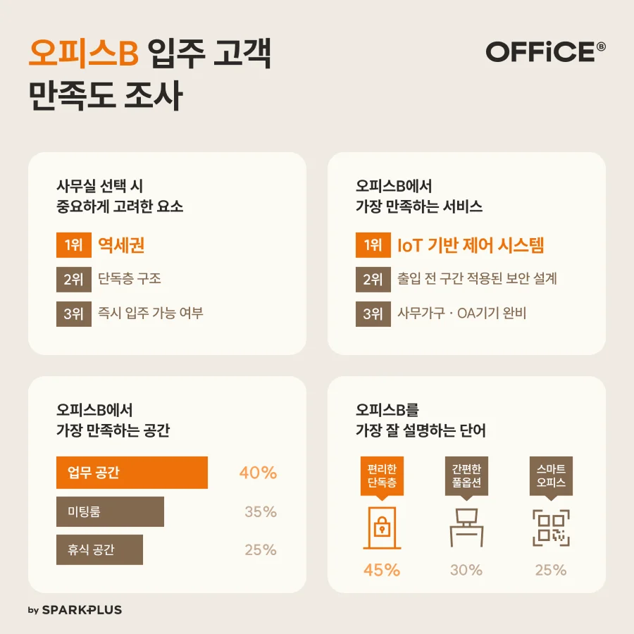 사무실 선택 시 가장 중요하게 여긴 요소는 ‘역세권 입지’, ‘단독층 구조’, ‘즉시 입주 가능 여부’였습니다.