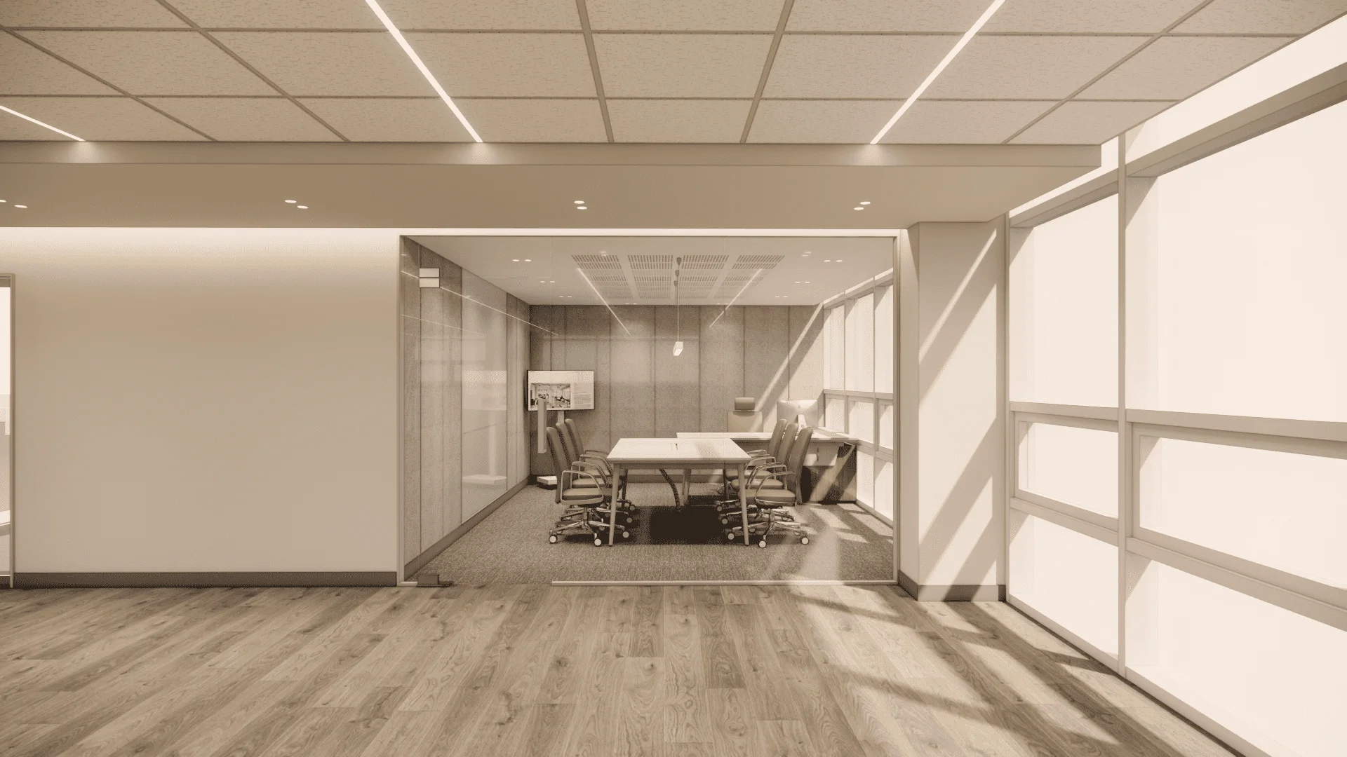 D사는 텅 빈 공간에 회의실과 대표실을 신설하고자 했습니다. 하지만 비용이 너무 커지지 않기를 원했습니다. 이에 따라 회의실은 창측으로 배치하여 시공 범위를 최소화하고, 유리벽으로 마감했습니다. 내부 공간은 소리가 울리지 않도록 벽과 천장은 흡음 소재로 마감했습니다.